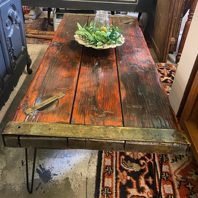 Coffee table made from a wwii liberty ship hatch cover by green barn woodworks.